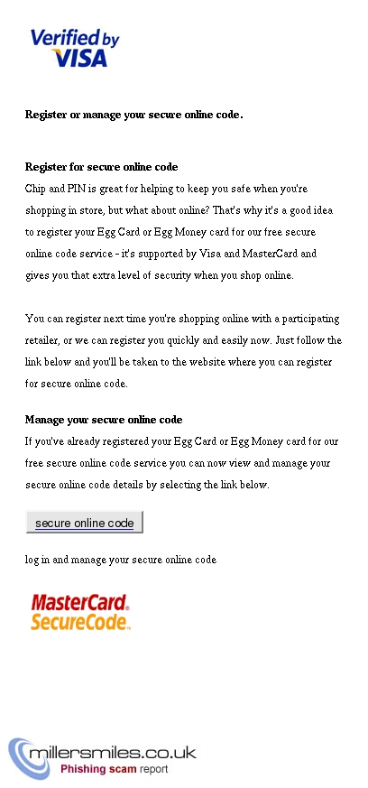• Email asks you to confirm/update/verify your account data at Egg Online Banking by visiting the given link. You will be taken to a spoof website where your details will be captured for the phishers.