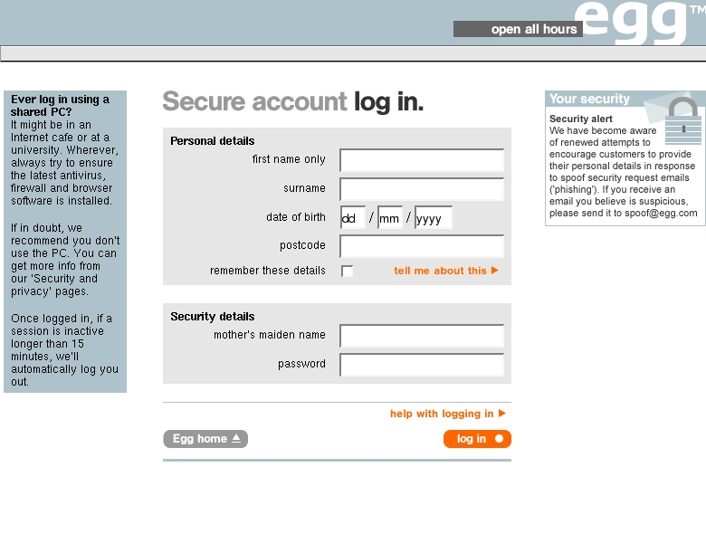 • Egg Online Banking never send their users emails requesting personal details in this way.