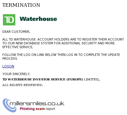 - Email asks you to confirm/update/verify your account data at TD Waterhouse. by visiting the given link. You will be taken to a spoof website where your details will be captured for the phishers.