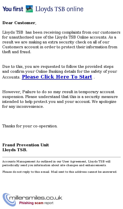 • Email asks you to confirm/update/verify your account data at LLOYDS TSB by visiting the given link. You will be taken to a spoof website where your details will be captured for the phishers.