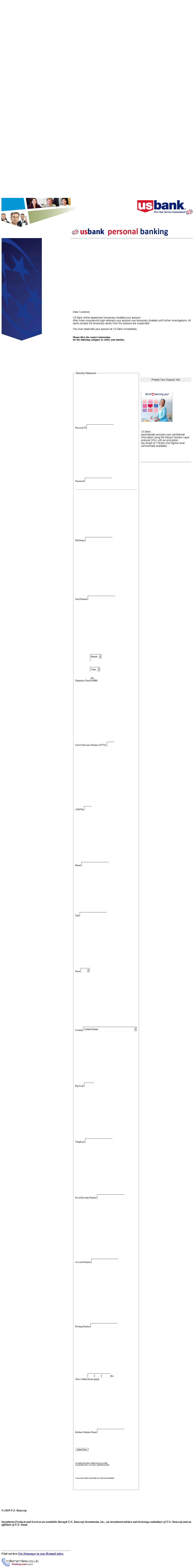 • Email asks you to confirm/update/verify your account data at US Bank by visiting the given link. You will be taken to a spoof website where your details will be captured for the phishers.