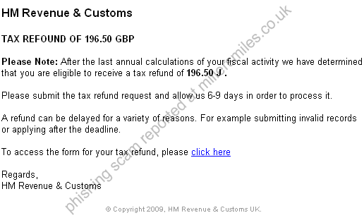 • Email asks you to confirm/update/verify your account data at HM Revenue and Customs by visiting the given link. You will be taken to a spoof website where your details will be captured for the phishers.