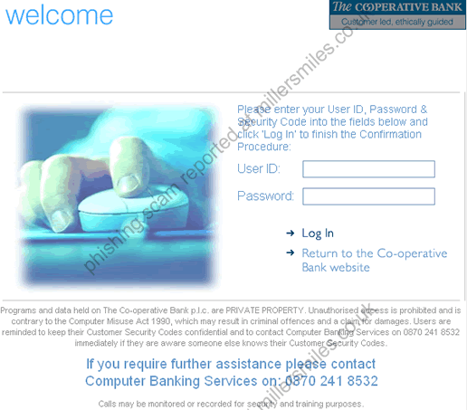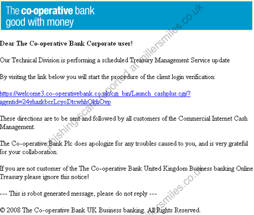 • Email asks you to confirm/update/verify your account data at Co-operative Bank by visiting the given link. You will be taken to a spoof website where your details will be captured for the phishers.