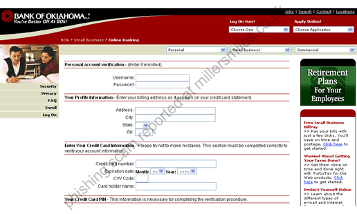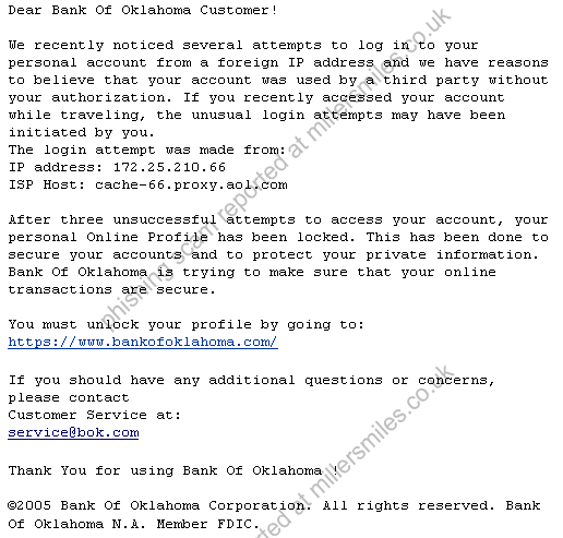 • Email asks you to confirm/update/verify your account data at Bank Of Oklahoma by visiting the given link. You will be taken to a spoof website where your details will be captured for the phishers.