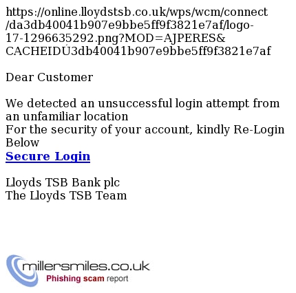 • Email asks you to confirm/update/verify your account data at Internet Banking Lloyds by visiting the given link. You will be taken to a spoof website where your details will be captured for the phishers.