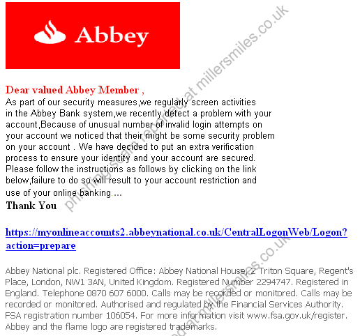 Email asks you to confirm/update/verify your account data at Abbey by visiting the given link. You will be taken to a spoof website where your details will be captured for the phishers.