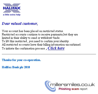 • Email asks you to confirm/update/verify your account data at Halifax 2010 by visiting the given link. You will be taken to a spoof website where your details will be captured for the phishers.