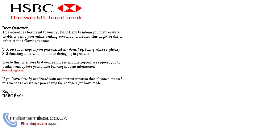 • Email asks you to confirm/update/verify your account data at HSBC by visiting the given link. You will be taken to a spoof website where your details will be captured for the phishers.