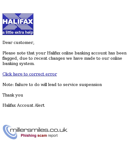 • Email asks you to confirm/update/verify your account data at Halifax Services by visiting the given link. You will be taken to a spoof website where your details will be captured for the phishers.