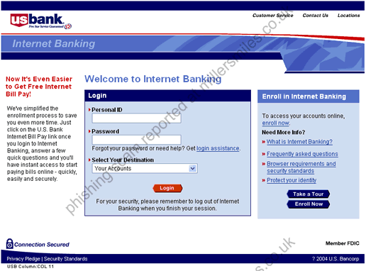 • Email asks you to confirm/update/verify your account data at U.S. Bank by visiting the given link. You will be taken to a spoof website where your details will be captured for the phishers.
