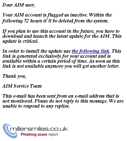 • Email asks you to confirm/update/verify your account data at AIM by visiting the given link. You will be taken to a spoof website where your details will be captured for the phishers.