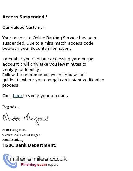 • Email asks you to confirm/update/verify your account data at HSBC by visiting the given link. You will be taken to a spoof website where your details will be captured for the phishers.