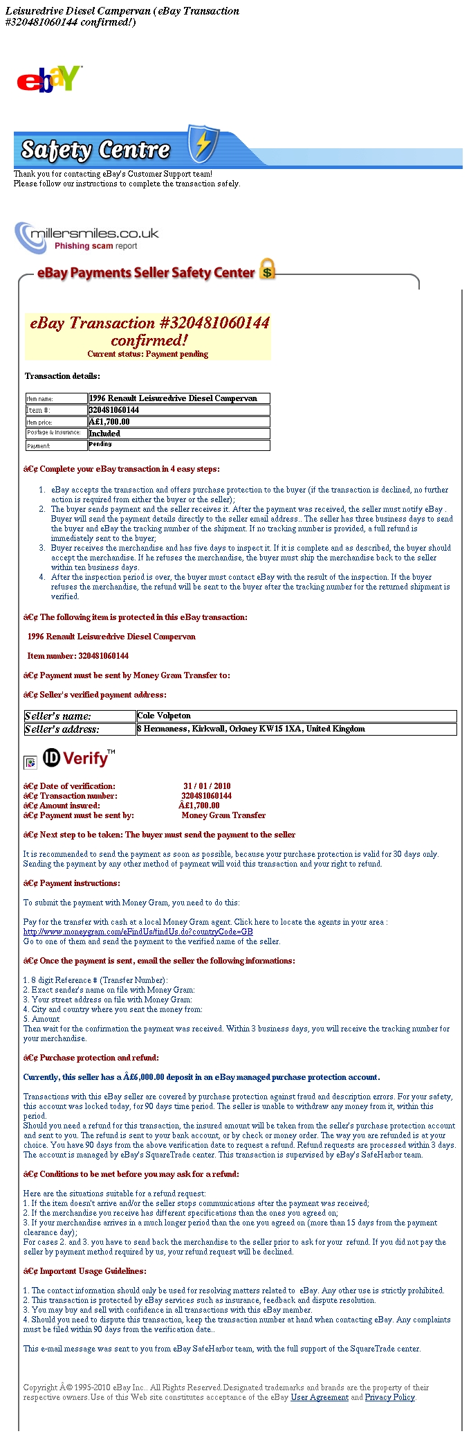 Your invoice for eBay item #320481060144, 1996 Renault Leisuredrive Diesel Campervan (eBay Transaction
